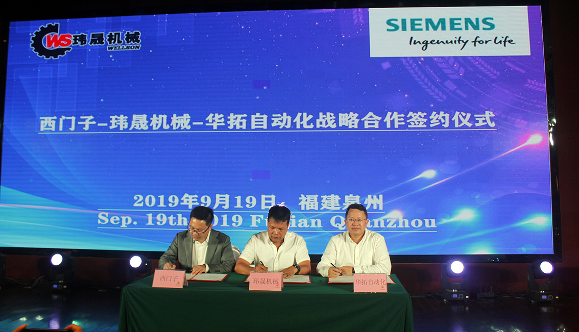 2019年9月19日下午,福建瑋晟機(jī)械有限公司、與西門(mén)子(中國(guó))有限公司、福建華拓自動(dòng)化技術(shù)有限公司“三方戰(zhàn)略合作”簽約儀式在福建泉州迎賓館舉行。福建瑋晟機(jī)械有限公司總經(jīng)理李德順先生、西門(mén)子(中國(guó))數(shù)字化工業(yè)集團(tuán)副總裁兼華南大區(qū)總經(jīng)理白利平先生 西門(mén)子(中國(guó))有限公司福建大區(qū)總經(jīng)理譚韜文先生、 福建華拓自動(dòng)化技術(shù)有限公司總經(jīng)理夏玉雄先生出席本次簽約儀式。